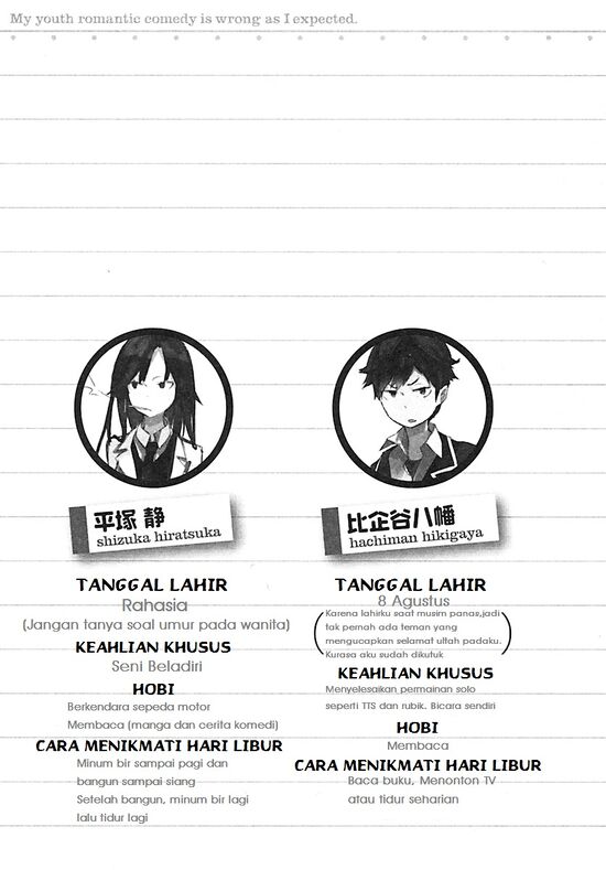 "Hikigaya, jawabanmu itu tak masuk akal. Apa sesakit itu kenanganmu saat kerja berkelompok? Atau jangan-jangan tak ada yang mau mengajakmu berkelompok?" Bu Hiratsuka memandangku, berlagak seolah cemas.