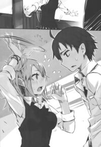 “Woa!” dia kaget. “Oh, H-Hikki. Aku sedang, um, k'mu tahu? Menciumi bunga mawarnya atau semacamnya…”